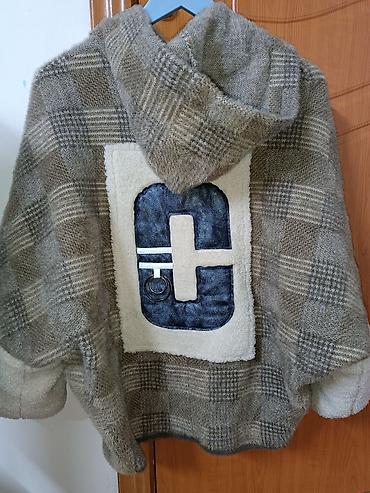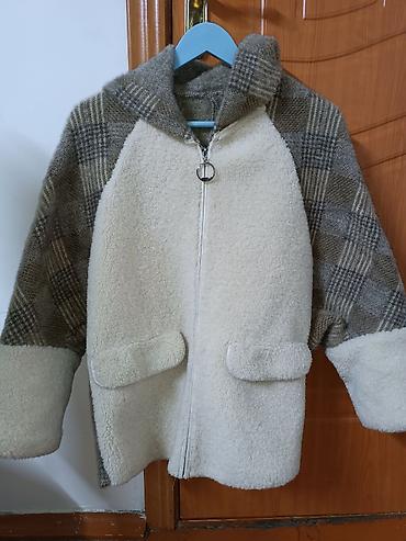- Материал: мягкий шерп/флис «тедди» молочного цвета спереди и на спинке; рукава и капюшон из плотного трикотажа с крупной клеткой в серо-бежевых тонах.