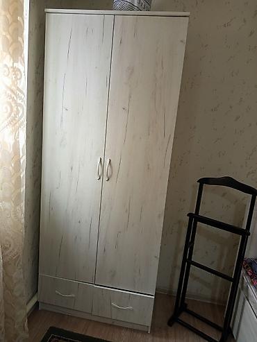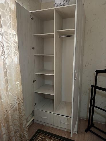 Двухдверный шкаф для одежды с зеркалом. Адрес : ж/ м кок жар улица ой терскен Характеристики: - Материал: ЛДСП, светлый древесный декор с выраженной текстурой. - Фасад: две распашные двери; н...