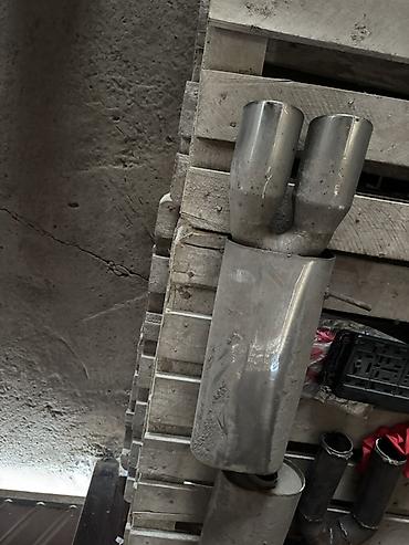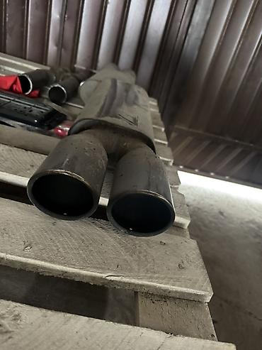 - На фото — два аналогичных глушителя и элементы выхлопа (трубы/переходы) для подгонки.
