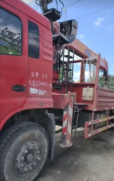 Грузовик-кран красного цвета, предназначенный для подъема и перемещения тяжелых грузов. Оснащен длинной стрелой с крюком, что делает его подходящим для строительных работ, погрузки и разгрузки материалов, а также для использования в складских помещениях или на открытых площадках. Прочная конструкция и мощный кран обеспечивают надежность и эффективность при выполнении различных задач. Шасси грузовика имеет 6 колес, обеспечивающих устойчивость и проходимость.