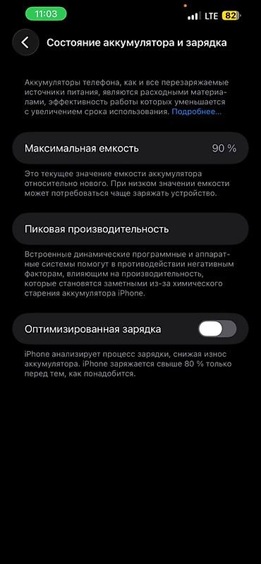 - Аккумулятор: максимальная ёмкость 90%, пиковая производительность поддерживается, оптимизированная зарядка включена