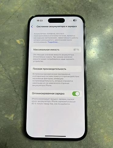 Состояние аккумулятора по скриншоту в настройках: максимальная ёмкость 87%, включена «Оптимизированная зарядка». На фото видно чистый порт USB‑C и объективы камер с защитными кольцами.