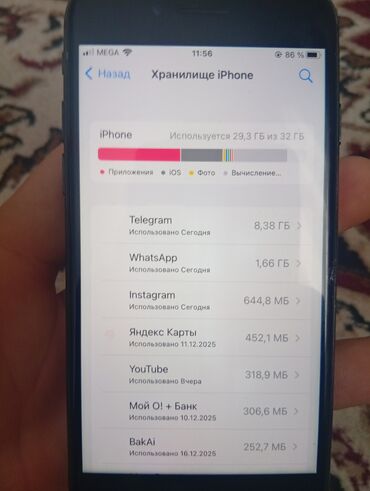 Экран «Хранилище iPhone» показывает установленные и используемые приложения (Telegram, WhatsApp, Instagram, Яндекс Карты, YouTube и др.).