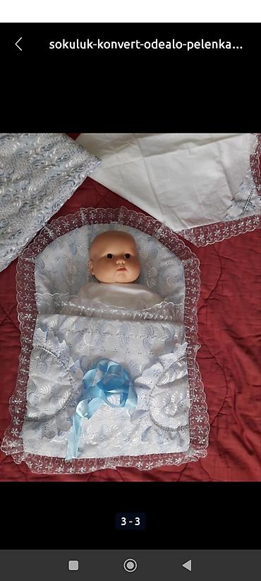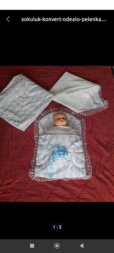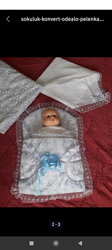 (Сокулук) Конверт + одеяло + пеленка-уголок на выписку+ чепчик и ленточка. В отличном состоянии, б.у 1 раз. В подарок лента, распашонка , чепчик белые, всё очень красивое .В живую красивее чем на фото