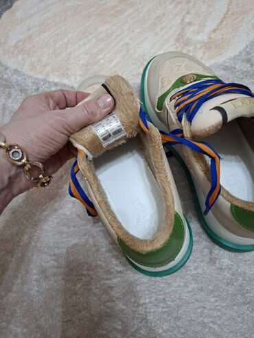 - Цвета: бежевый/молочный верх с фирменным жаккардовым монограмным узором GG, зелёные вставки и рант, зелёная подошва; шнурки синие с оранжевыми полосами.