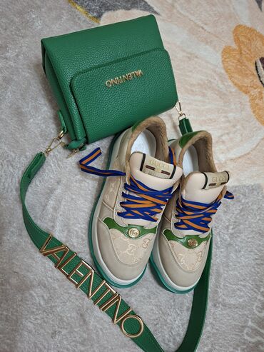 На фото также зелёная кожаная сумка Valentino с крупным логотипом на клапане и ремнём с металлическими буквами VALENTINO.