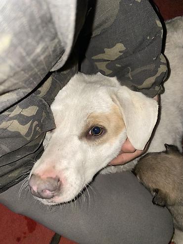 Щенок небольшого размера, светлой окраски (белая шерсть с кремовыми