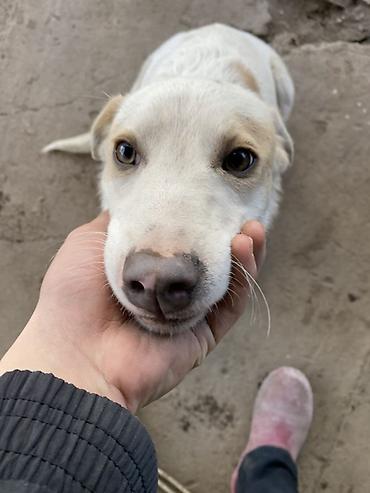 Щенок метис, пушистый и активный. Окрас светлый кремовый с темными отметинами на голове и пятном на спине, нос черный. Шерсть густая, мягкая, хорошо подходит для холодной погоды. Глаза светлые, выр...