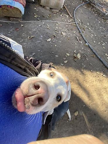 Американский питбультерьер, белый окрас с рыжими отметинами у глаз. Крепкий, мускулистый пёс среднего-крупного размера, короткая гладкая шерсть, розовая мочка носа. Уши купированы. На фото в прочно...
