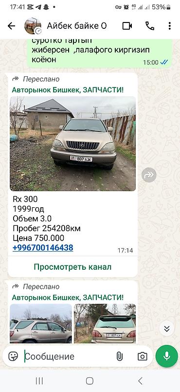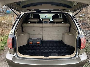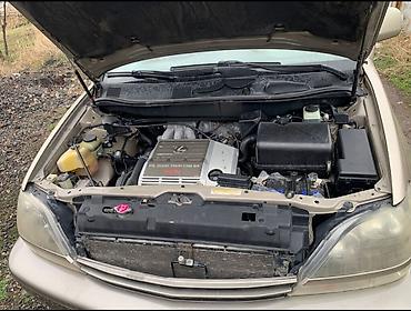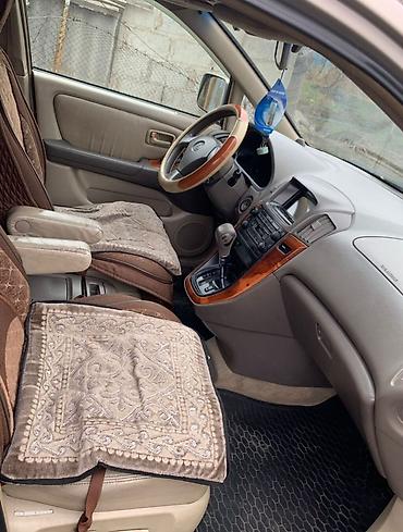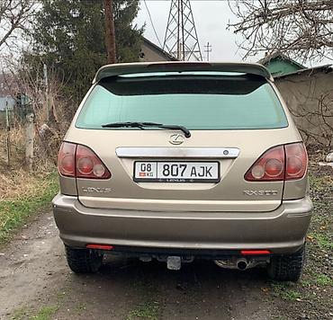 Lexus RX 300, кроссовер 5‑дверный, бежевый металлик. Полный привод. Заводская эмблема и шильдик RX 300. Легкосплавные диски, всесезонные шины, задний спойлер, рейлинги, фаркоп. Противотуманные фары, омыватели фар, повторители поворотов в крыльях.