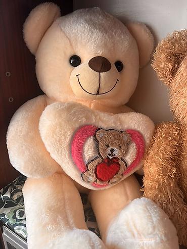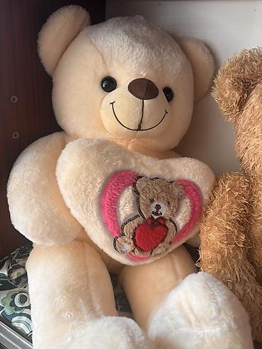 Мягкая игрушка — плюшевый мишка светло‑кремового цвета. Большие блестящие глазки, коричневый носик и вышитая добрая улыбка. Мишка держит объемное сердечко на груди с нашивкой медвежонка и красным сердцем, окантовка в розово‑малиновом тоне. Ткань очень мягкая, бархатистая на ощупь; наполнитель упругий, мишка хорошо держит форму и удобно сидит. Крупный размер с длинными лапами — подойдёт как декоративная подушка, для объятий и фотосессий, а также как подарок на праздники и признания. Универсальный дизайн и нейтральная расцветка подойдут детям и взрослым.