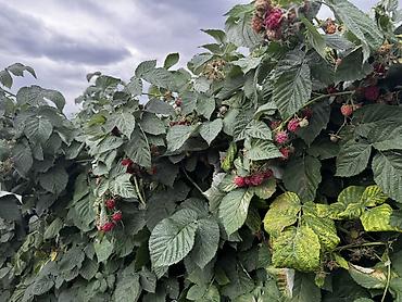 Саженцы малины (плодоносящие ряды) - Культура: малина садовая, крупноплодные кусты. - Стадия: плодоношение в текущем сезоне; на побегах завязи и спелые ягоды. - Посадка: сформированные ряды, кусты...