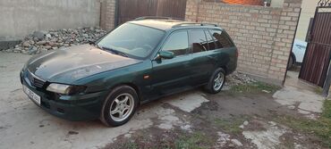 Mazda 626 универсал (GF). Темно-зелёный цвет, пятидверный кузов с рейлингами на крыше и тонированными задними стеклами. Номера KG на автомобиле.