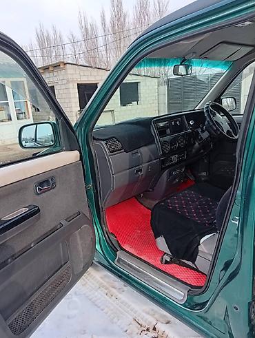 - Салон: три ряда сидений, раздельные кресла второго ряда, тканевые чехлы, высокий потолок; красные коврики; большие окна.