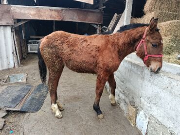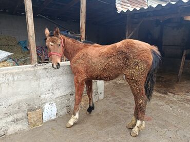 Молодой жеребёнок, масть рыжая с чёрным хвостом и гривой, отметины: звёздочка на лбу, белые чулочки на передних и задних ногах. На фото — в недоуздке, спокойно стоит на привязи. Коренастое телосложение, крепкие конечности, ровная спина, правильная постановка ног. Подходит для дальнейшего выращивания под верховую езду или упряжь, перспективен для хозяйственных работ и прогулок. Привык к стойловому содержанию, не агрессивный, контактный, интересуется человеком. Хорошо переносит чистку и уход, без проблем заходит в денник. Рацион — сено, сочные корма; на фото видно место содержания и заготовку кормов. Отличный вариант для тех, кто ищет перспективного молодняка для обучения и работы в хозяйстве.