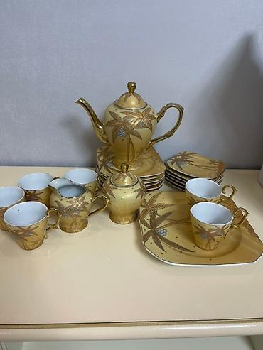 2) Чайный сервиз в золотистом оформлении с пальмовым орнаментом: