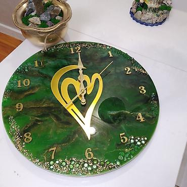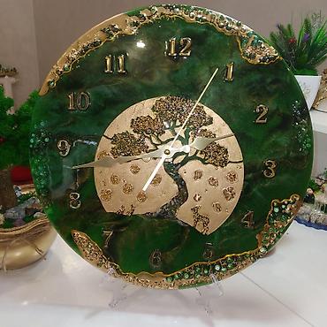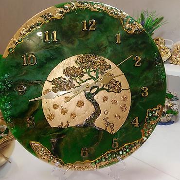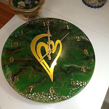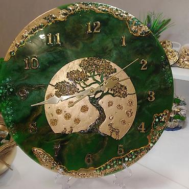 Настенные часы из эпоксидной смолы, круглая панель глубокого изумрудно‑зеленого цвета с перламутровыми переливами. Декор выполнен в технике художественного литья: объемные вставки «геода» по краю с міксами стеклянных бусин и глиттера, золотые прожилки и рельеф. Центральный акцент — золотой медальон с рельефным деревом жизни и миниатюрными элементами; на альтернативном циферблате — стилизованное золотое сердце. Цифры арабские, накладные, металлического золотистого оттенка; стрелки изящной формы в тон. Диаметр ориентировочно 35–40 см (по фото). Бесшумный кварцевый механизм (AA). Идеально для гостиной, спальни или офиса, работает как функциональный прибор и декоративное панно в стиле арт-геод/лофт-глам. Подставка для демонстрации на фото не входит в состав; часы предназначены для подвеса на стену.