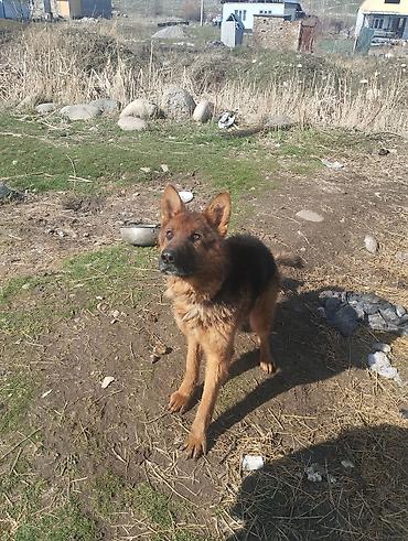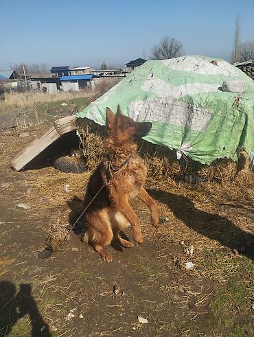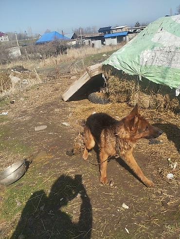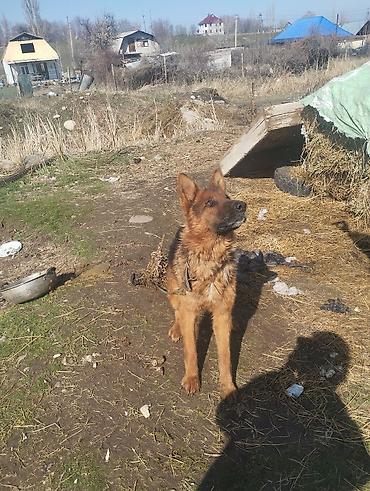 Немецкая овчарка, рыжево-черный окрас, кобель крупного формата. Пропорциональное телосложение, крепкая спина, глубокая грудь, выраженная мускулатура. Уши стоячие, хвост пушистый, густой шерстный покров с подпалом. На фото собака активная, внимательная, с ярко выраженной охранной реакцией и отличной концентрацией на хозяине. Подходит для двора и участка, способен к караульной службе и дрессировке базовым командам. На шее широкий ошейник, содержится на цепи/привязи — привык к уличному содержанию, выдерживает высокий темп, любит подвижные игры и мотивацию лакомством/игрушкой. Хорошо ориентируется на человека, быстро откликается и фиксирует взгляд, демонстрирует устойчивость и собранность.