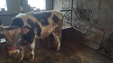 Телка. - Возраст: телёнок на откорм. - Окрас: бело-рыжий пятнистый. - Идентификация: ушные бирки установлены. - Содержание: стойловое, привязанная система; кормление сеном. - Характеристики: крепк...