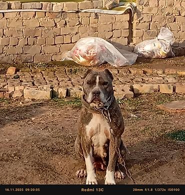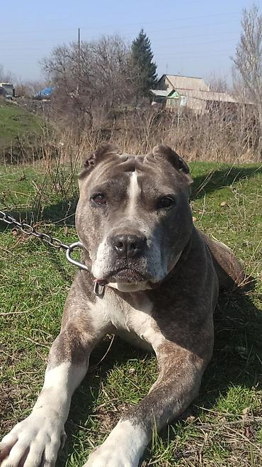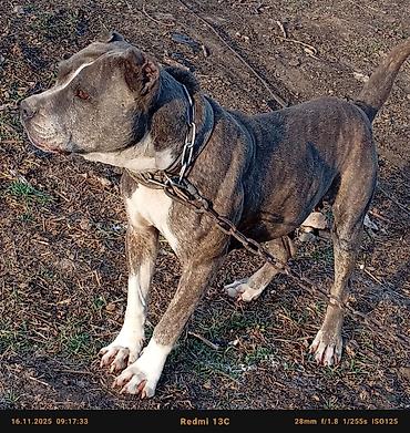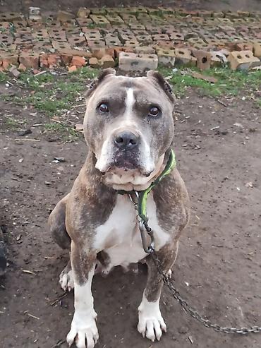 Кобель мощного типа, короткошёрстный, тигровый окрас с белыми отметинами (грудь, лапы, проточина на морде). Компактный, приземистый формат, широкая грудь, выраженная мускулатура, крепкий костяк. Голова массивная, уши купированы, прикус ножницеобразный, пигментация хорошая. Хвост естественный.