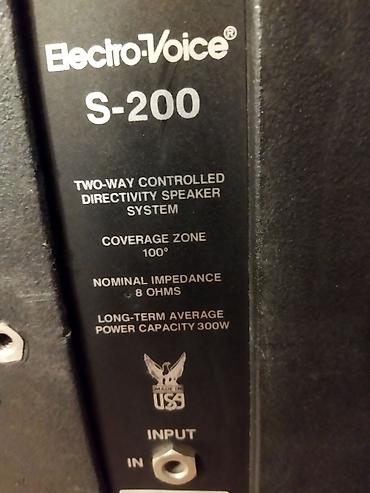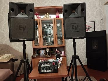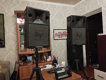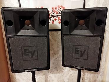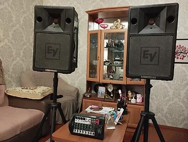 - Пара акустических систем Electro‑Voice EV Stage System 200 (пассивные), корпус из ударопрочного пластика, рупорная ВЧ‑секция, фазоинверторы спереди; логотип EV на грилях. Установлены на прочные штативы с регулировкой высоты.