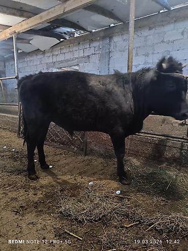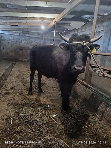 Бык (чёрно‑пёстрый окрас), рогатый, на привязи в стойле. Порода мясо‑молочного направления. Корпус широкий, крепкий костяк, ровная линия спины, развитая мускулатура. Носовое кольцо/недоуздок для ко...