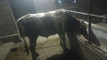 Бык (молодняк КРС), масть пёстрая (чёрно-белая с рыжими участками). Содержится на привязи в стойловых условиях, кормушка бетонная, ограждение металлическое. Корпус вытянутый, развитый круп, сильные ноги, широкая грудь. Подходит для откорма на мясо или как производитель для небольшого хозяйства. Спокойный, выдерживает стойловое содержание, ест из кормушки, привыкает к режиму. Возможна перевозка в стандартном скотовозном прицепе.