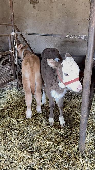- Молодые телята, выращены на индивидуальных стойлах.