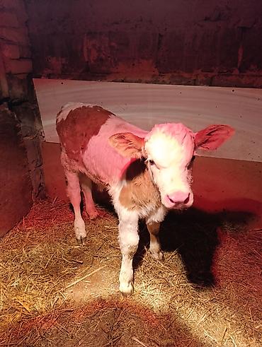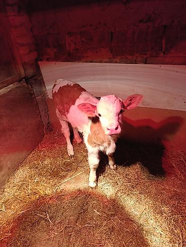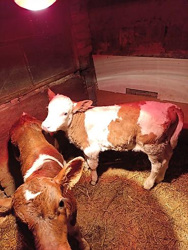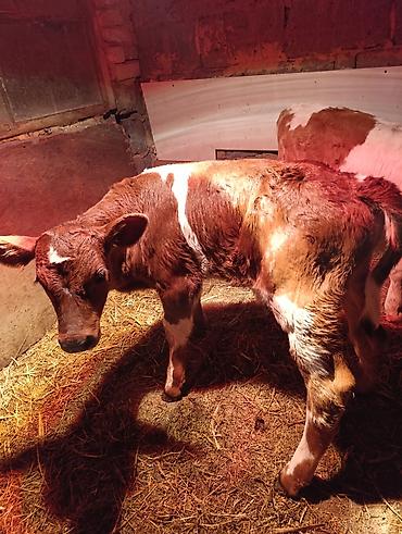 Симминтал, мама красно-пёстрая симментальская, папа — чистый симментал (искусственное осеменение) Второй телёнок,папа ангус, а мама голштин