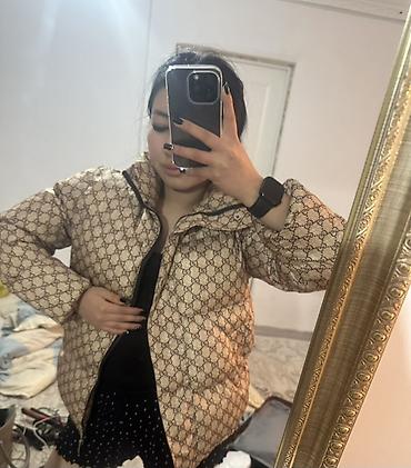 - Теплая утепленная куртка-пуховик бежевого цвета с фирменным all-over принтом GG.