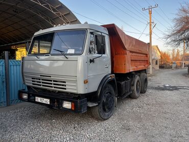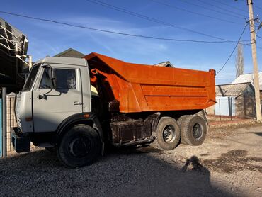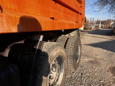 Самосвал с оранжевым кузовом, предназначенный для перевозки сыпучих материалов. Оснащен двойными задними колесами для улучшения устойчивости и грузоподъемности. Задние фонари и брызговики обеспечив...