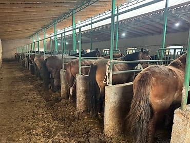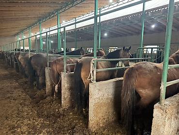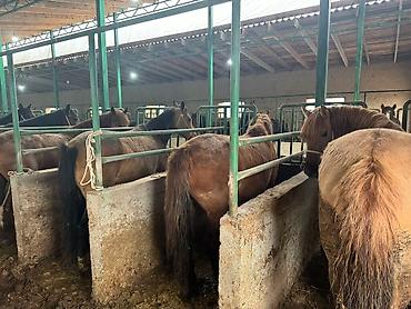 Лошади (несколько голов), содержатся в крытом кирпичном конюшенном помещении с секциями и металлическими перегородками. Характеристики по фото: - Масти: рыжая, гнедо-рыжая и темная (вороная/темно-...