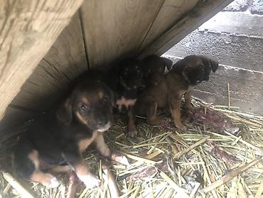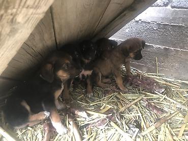 - Помёт: 4 щенка, окрас разный — чёрно-подпалый и рыжевато-коричневый, короткая гладкая шерсть.