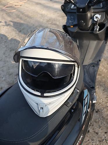 - Закрытый мотошлем (модуляр/интеграл) с прозрачным внешним визором и внутренними затемнёнными очками, вентиляцией на подбородке и верхних каналах.