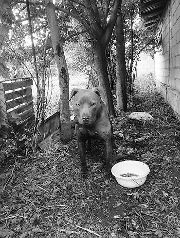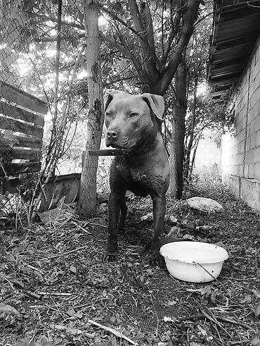 Собака среднего размера, короткошёрстная, мускулистого телосложения. Окрас однотонный тёмный. Уши полустоячие, хвост прямой. На фото — на ошейнике и цепи, в вольерных условиях двора. Рядом — пластиковая миска для корма/воды. Собака бдительная, с выраженной охранной поведенческой реакцией, ориентирована на территорию.