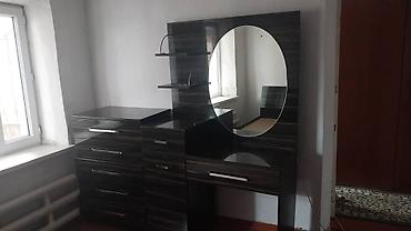 - Туалетный стол с большим овальным зеркалом, выдвижным ящиком и открытыми полками для косметики и аксессуаров.