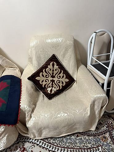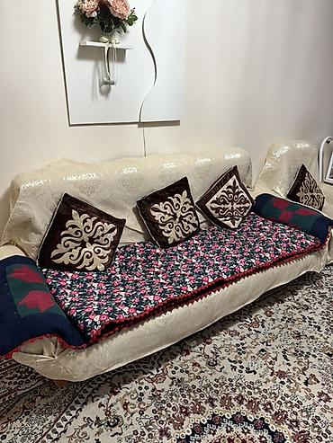 - Диван прямой, мягкие подушки в комплекте, нейтральная светлая обивка; сверху декоративное покрывало/накидка.