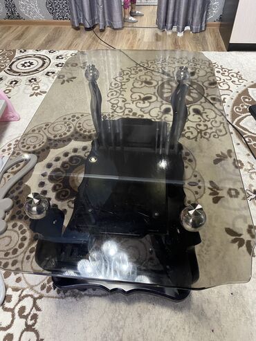 Стеклянный журнальный столик в хорошем состоянии, но одна ножка её отвалилась, можно склеить. Цвет - чёрный, материал каркаса - дерево