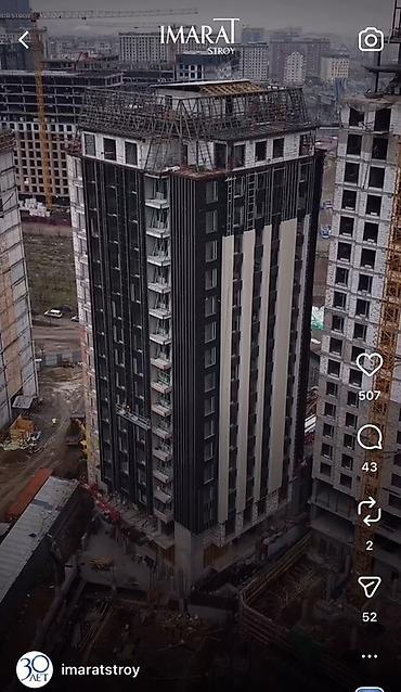 Здания бизнес-класса с выразительными фасадами, большим количеством окон и балконов. Территория окружена массивом зелёных насаждений. На визуализациях и фото показаны ход строительства и общий мастер‑план квартала. Имарат Stroy — застройщик проекта.