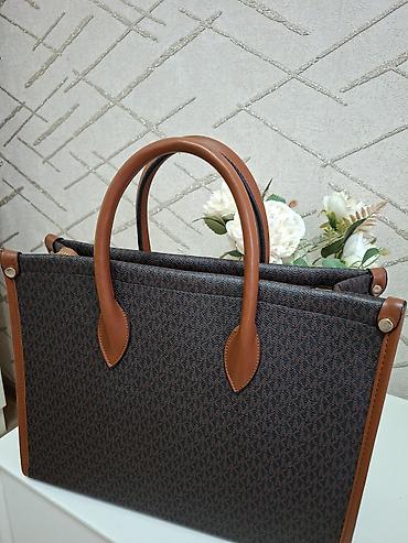 - Цвет: темно-коричневый с монограммой MK, контрастная отделка и ручки в карамельном оттенке.