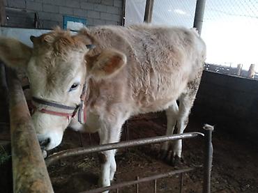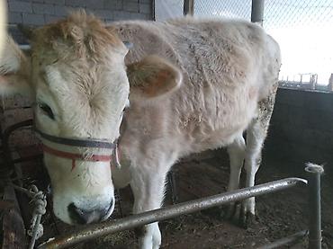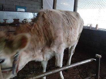 Телка светло-палевого окраса, рогатая, на привязи в стойле. Плотный костяк, широкая спина и грудь, ровная линия спины, крепкие конечности. Шерсть густая, зимняя. Активная, хорошо ест с кормушки (зеленая масса/сено видно на фото). На морде — недоуздок с регулировкой и креплением к привязи. Подходит для дальнейшего выращивания на молочное или мясное направление хозяйства. Возможен выгул и содержание в стойле.