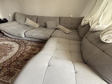 Угловой модульный диван большого размера в форме П. - Обивка: мягкая износостойкая ткань светло‑серого цвета. - Конфигурация: три секции, образующие П‑образный угол; глубокие посадочные места. - С...
