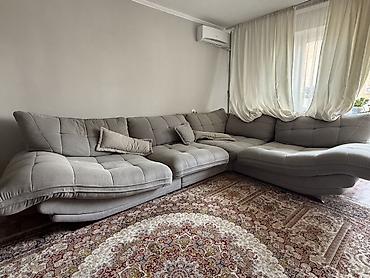 Большой угловой диван из мягкой велюровой ткани серого цвета. Прямые линии и стеганые подушки спинки с декоративными пуговицами. Широкие подлокотники, глубокие посадочные места. Секции модульные: н...
