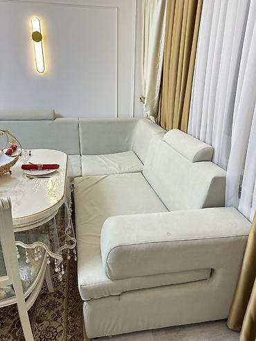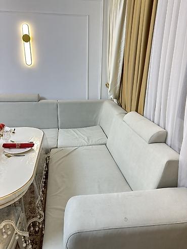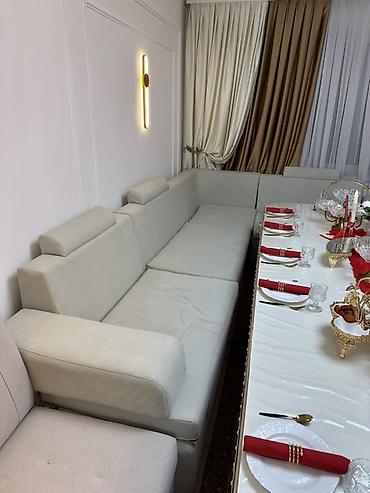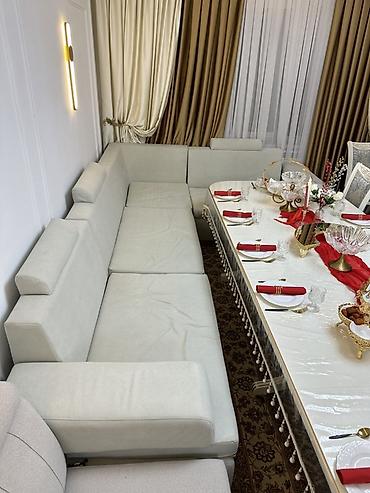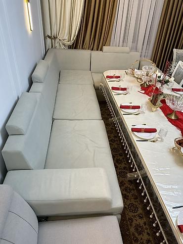 - Конфигурация: Г‑образный, три посадочных секции с обеих сторон стола, одна широкая подлокотная секция; модульный тип — элементы стыкуются в угол.