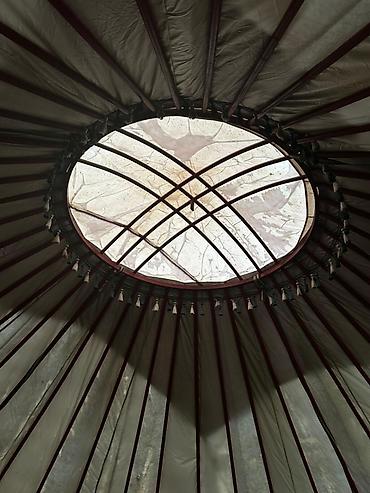 - Каркас из решётчатых стен (кереге) с купольными шестами; сверху плотный светлый тент.
