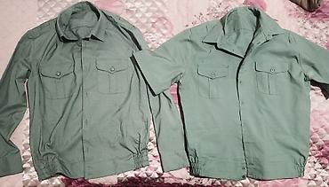 - 2 рубашки защитно-зелёного цвета: одна с длинным рукавом, одна с коротким рукавом. Застёжка на пуговицах, два нагрудных кармана с клапанами, по бокам эластичные вставки/сборки по низу.
