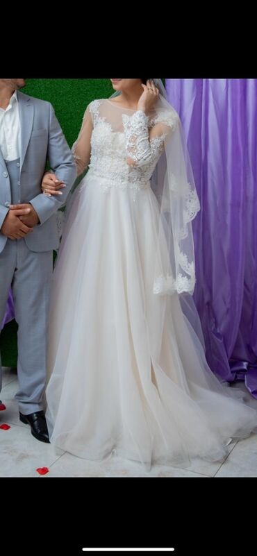 Свадебное платье новое размер ХS S M - Цвет: белый. - Силуэт: прямой/умеренно приталенный. - Длина: в пол, со шлейфом. - Ткань: кружево и сетка с рассеянным бисерным/жемчужным декором по всему по...