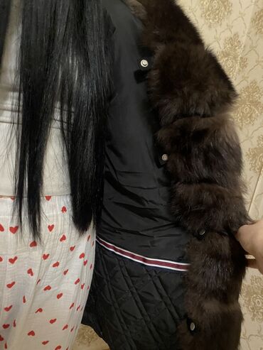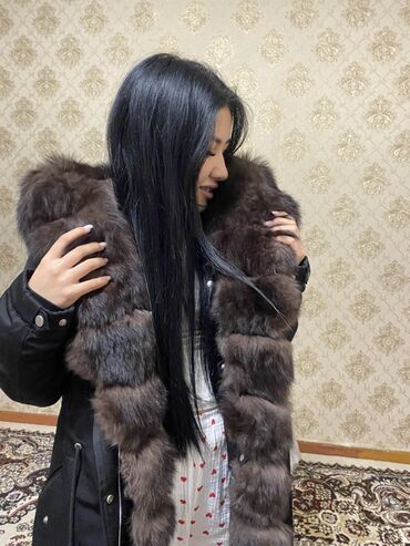 - Меховая отделка: густой коричневый мех по планке застежки и объемный меховой капюшон/ворот.