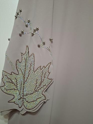 - Декор: объемные вышитые листья и веточки, расшитые мерцающими стразами и металлическими бусинами; украшение по линии горловины, на рукавах и по низу.