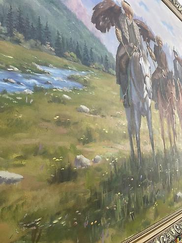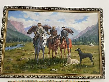 Живопись на холсте в раме. Сюжет: охотники-беркутчи на конях в горной